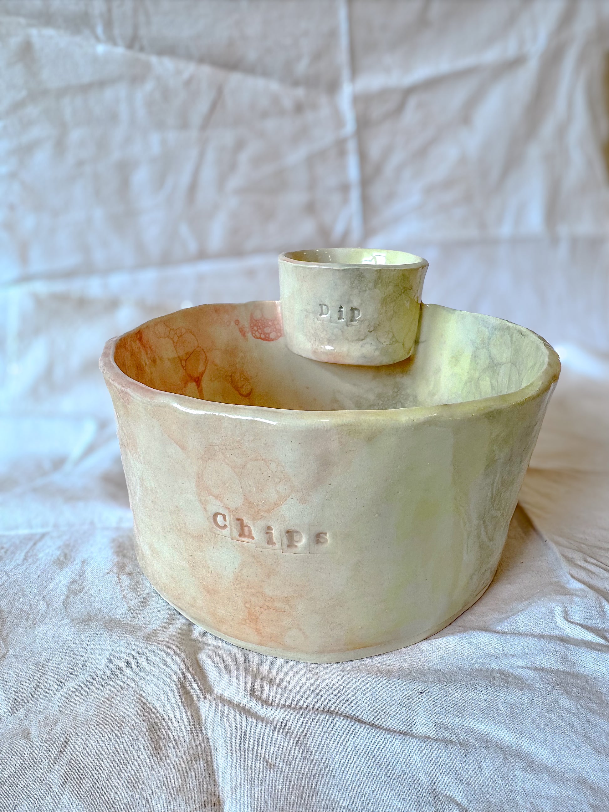 Brighten up your snack spread with this one-of-a-kind, hand-pinched chip & dip bowl! Made from a single slab and lovingly shaped by hand, this piece features a stunning rainbow bubble glaze that dances across the surface in dreamy swirls and pops of colour.