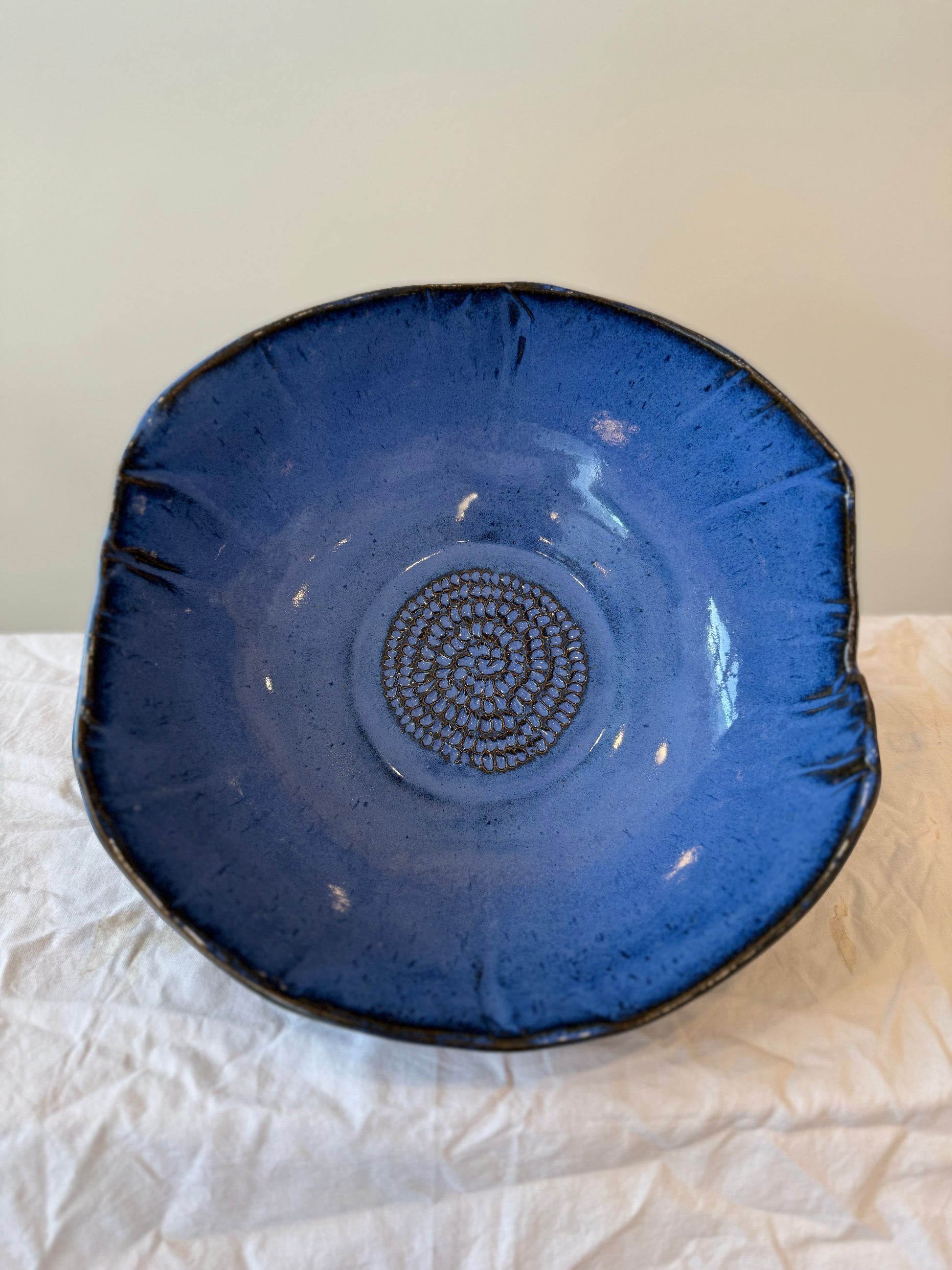 Glazed in a stunning, deep Midnight Cobalt, the finish breaks beautifully over the hand-stamped texture. The organic, four-point rim provides a modern silhouette that looks beautiful as a centerpiece on your dining table.